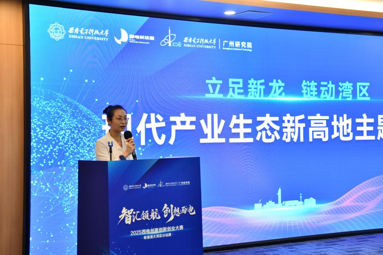 新龙镇人民政府经济办相关负责人员进行了“立足新龙,链动湾区”——现代产业生态新高地主题推介。她详细介绍了新龙镇作为中新广州知识城新龙副中心,在区位优势、规划优势、政策优势、产业优势与发展方面的情况,并表示西电教研成果转化,在新龙必定大有可为。