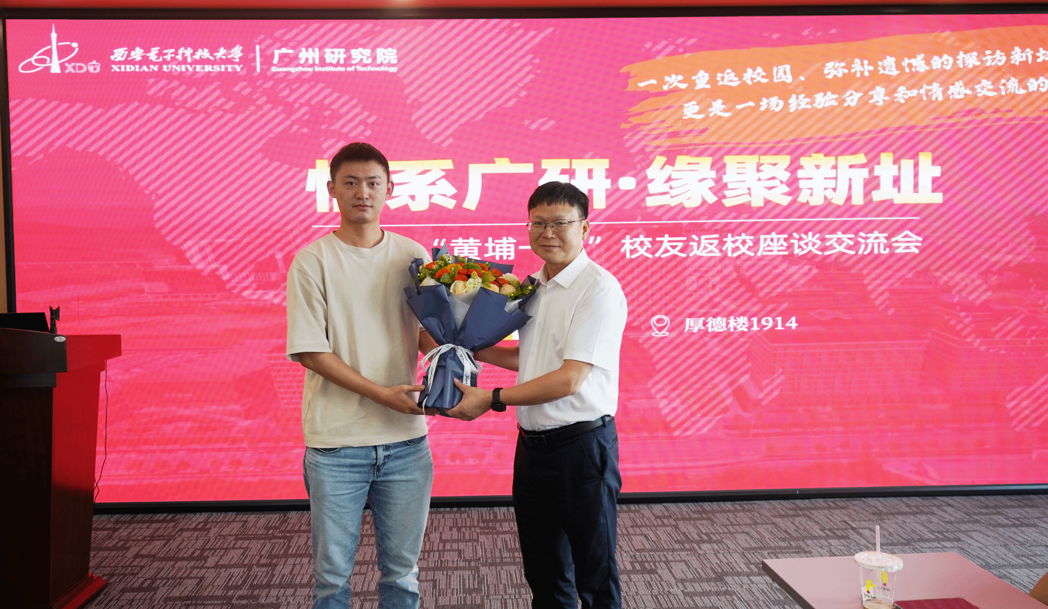提出了中肯而宝贵意见和建议。校友们非常感谢研究院提供的务实、包容的育人氛围,为他们的成长提供了肥沃的土壤。在这里,不仅学到了专业知识,更学会了如何思考、如何解决问题,逐渐从青涩蜕变,走向成熟。校友代表、目前任职于广州视源电子科技股份有限公司的林伟权向研究院刘丰雷书记献花表达饮水思源、感恩母校之情。