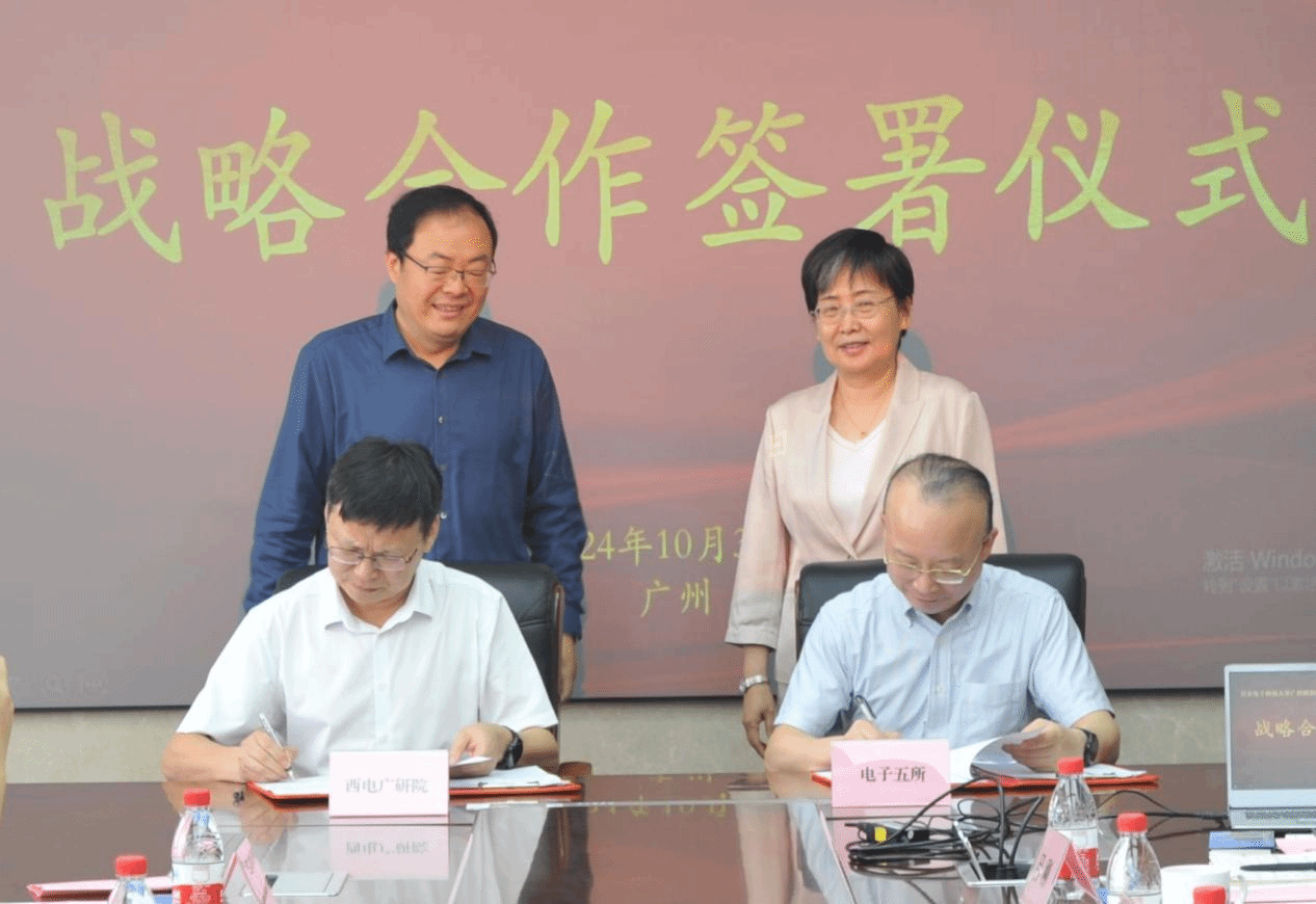 电子五所党委书记恩云飞与刘宏伟就当前双方合作情况以及未来合作方向进行深入交流,双方希望通过更加深入紧密的合作促进优势互补和资源共享,推进学校融入企业为主体的科技创新体系,携手助力粤港澳大湾区建设国际科技创新中心。会上,双方举行“西电广研院-电子五所”战略合作协议签约仪式,在刘宏伟与恩云飞的见证下,西电广研院党委书记刘丰雷、电子五所技术推广处处长彭文忠分别代表双方签署协议。